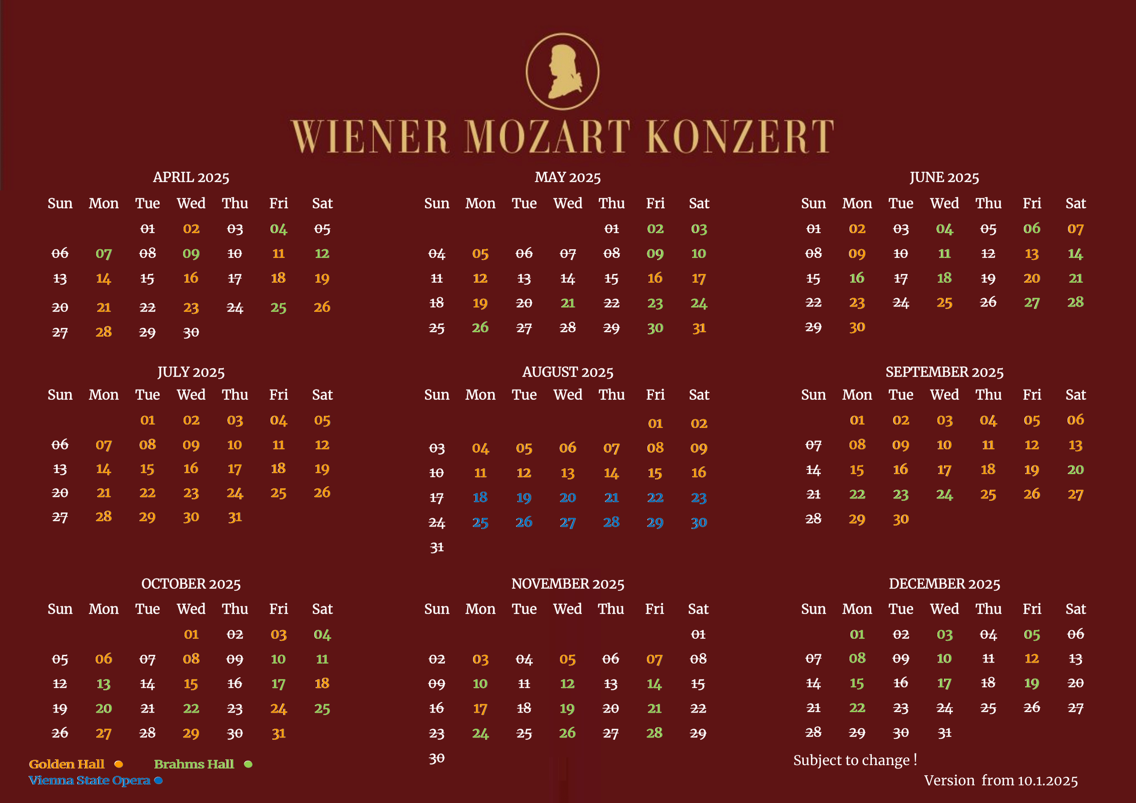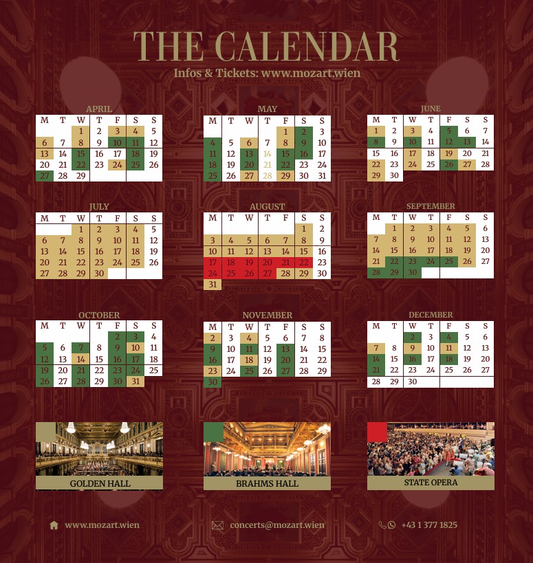 Most of the Mozart Orchestra’s concerts take place from the last week of March to the end of October. In recent years, the range of concerts has been expanded to the Christmas period – in December only. You can see the details of the concerts in the schedule below. Pay attention to the colors in the schedule. Each color symbolizes a different concert hall from the 3 mentioned above: